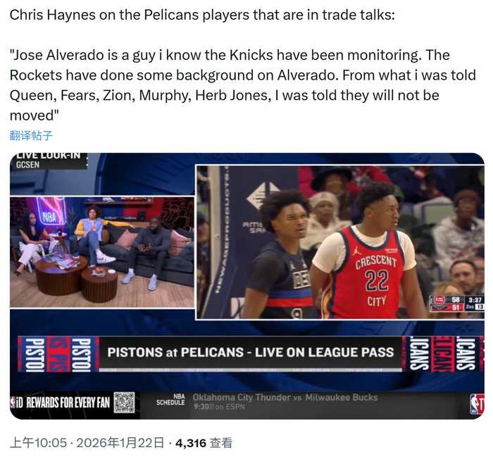 尼克斯火箭关注阿尔瓦拉多,鹈鹕五将确定留队