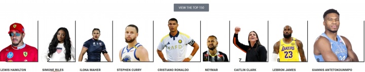 1-汉密尔顿(F1)、2-拜尔斯(体操)、3-马厄(女子橄榄球)、4-库里(篮球)、5-C罗(足球)、6-内马尔(足球)、7-凯特琳-克拉克(篮球)、8-詹姆斯(篮球)、9-字母哥(篮球)、10-高芙(网球)