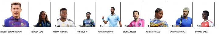 11-莱万(足球)、12-赖萨-莱亚尔(女子滑板)、13-姆巴佩(足球)、14-维尼修斯(足球)、15-德约科维奇(网球)、16-梅西(足球)、17-乔丹-切尔斯(体操)、18-阿尔卡拉斯(网球)、19-萨卡(足球)、20-安吉尔-里斯(篮球)