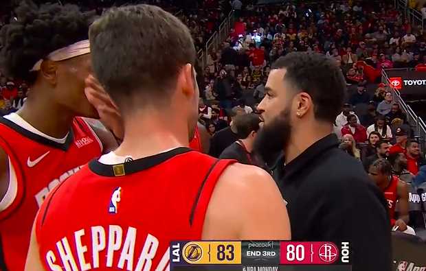 比赛第三节,火箭连续出现失误被湖人轰出高潮反超,范弗利特三节节间面授阿门和谢泼德运球事宜。