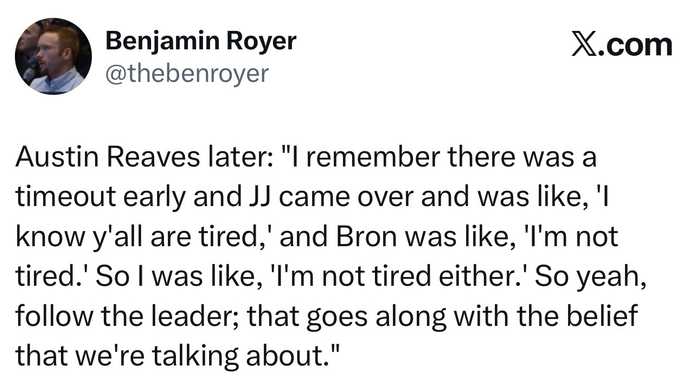 里夫斯对记者说,比赛开始后的第一个暂停时,雷迪克说:“我知道你们都很累了。”詹姆斯回答:“我不累。”里夫斯马上跟着说:“我也是,不累。”跟着领袖,这与我们所谈论的信念是一致的!