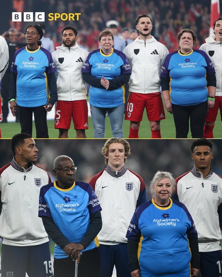 那场比赛有一个非常美好的时刻,为了提高人们对阿尔茨海默症和痴呆症的认识,他们安排了患有这些疾病的老一辈球迷作为球童入场,球员们牵着他们走出来。然而,在奏国歌的时候,我确实注意到他们留下了其中两位,其中一位还坐在轮椅上。威尔士队奏国歌时,他们都和球童们挤在一起。但令人难过的是英格兰这边……球员们都挤作一团,而那位坐在轮椅上的先生被留在了那里,没有人试图去帮助。