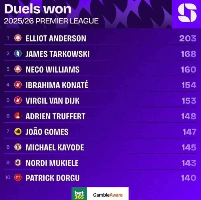 英超本赛季对抗成功榜安德森居首,夺回球权榜亦领跑